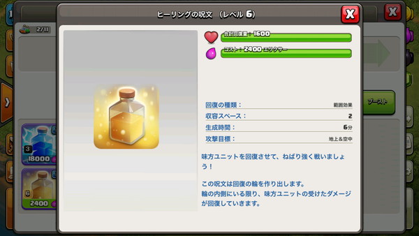 味方を回復したり、敵の設備やユニットにダメージを与えたり、防衛設備をフリーズさせたりと、様々な効果の呪文があり、攻撃時には非常に大きな役割を持ちます。
